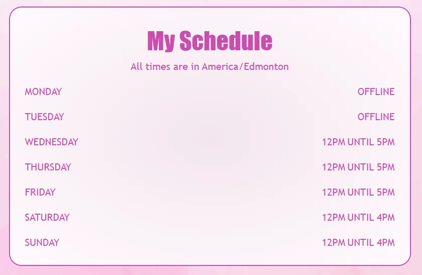 Кулинария, Косплей, Грязные разговоры, Засвет, Фут-фетиш, Шлепки, Стриптиз, Тверкинг, Под юбкой, Ахэгао, Топлесс, Минет, Глубокая глотка, Эротические танцы, Кончить на лицо, Дилдо или вибратор, Секс-игрушки, Оргазм, Мастурбация, Мастурбация пальцами, Раком, Поза наездницы, Верблюжья лапка, Кляп, Йога, Рейтинг члена, Унижение, Инструкция по дрочке, Ролевые игры, Госпожи, Каблуки, Между грудей